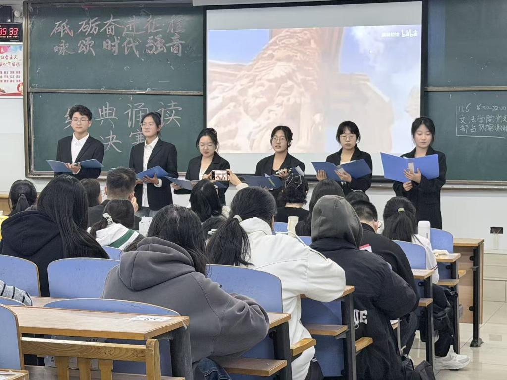 活动自启动以来,受到了同学们的广泛关注和积极参与。10月30日、31日举行的初赛现场已是气氛热烈,参赛者们初露锋芒,展现了良好的精神风貌与专业基础。11月6日的决赛现场,氛围更是庄重而激昂。张彩秋、王杰彦、王芳、马会会、汪曼五位专业教师应邀莅临决赛现场,并担任评委进行严格评审。晋级决赛的十四支队伍依次登台,倾情演绎了《青春中国》、《我的自白书》、《诗意中国》等经典篇目。选手们凭借扎实的语言功底、展现出了对文本的深刻理解与出色的舞台表现力,或慷慨激昂,或深情婉转,将无声的文字化为饱含爱国激情的有声力量,为现场师生带来了一场高水平的视听盛宴。