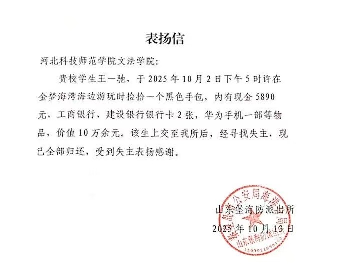 事情还要从半个月前说起10月2日王一驰在秦皇岛金梦海湾沙滩玩耍突然看到前方不远处有一个黑色的手提包环顾四周,几乎没什么人,他断定应该是哪位游客遗忘在这里的当时包里有厚厚一沓现金、一部手机还有几张银行卡,王一驰提着包在原地等了十来分钟始终没人来认领他又提着包到处寻找失主依然没有结果,正一筹莫展时前方走来两位执勤民警他连忙走上前将事情经过详细告知山东堡海防派出所民警商严和同事接过手提包简单清点了包内资产估算总价值超10万元他们夸赞王一驰“拾金不昧,好样的!”并询问了他的个人信息,商严和同事将手提包带回派出所后通过多种方式,很快联系上了失主失主认领时激动不已几天后失主到派出所送来一面锦旗反复恳请民警一定转送给恩人10月15日商严将这面锦旗和派出所出具的表扬信一并送到网投十大信誉可靠平台保卫科由网投十大信誉可靠平台老师最终转送给了王一驰。