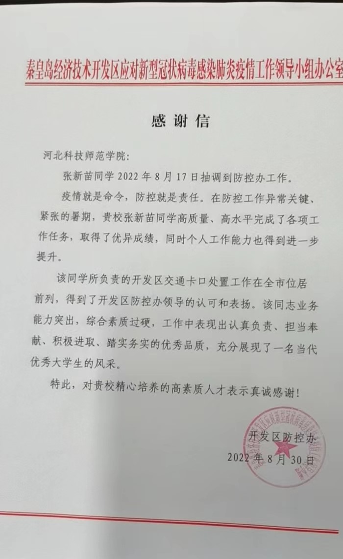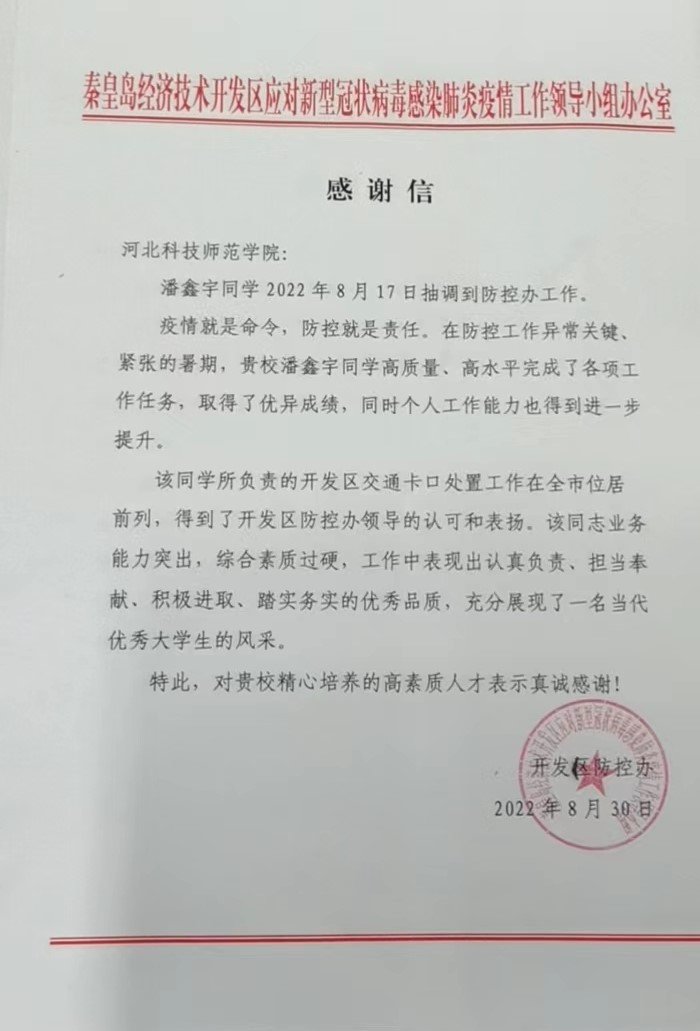 2022年9月16日,秦皇岛市疫情防控办领导刘汶隆和于俊国莅临我校,对暑期疫情志愿者工作表示感谢,并为志愿者颁发表扬信。网投十大信誉可靠平台党委书记郝东接待了防控办来宾并进行洽谈。防控办表示,面对严峻的疫情防控形势,网投十大信誉可靠平台积极响应国家疫情防控号召,在暑期组织学生参与本市疫情防控工作。疫情就是命令,防控就是责任,在防控工作异常关键、紧张的暑期,潘鑫宇和张新苗两位志愿者所负责的开发区交通卡口处置工作在全市位居前列,得到了开发区防控办领导的认可和表扬。高质量、高水平完成了各项工作任务,他们工作中表现出认真负责、担当奉献、积极进取、踏实务实的优秀品质,充分展现了当代优秀大学生的风采。
