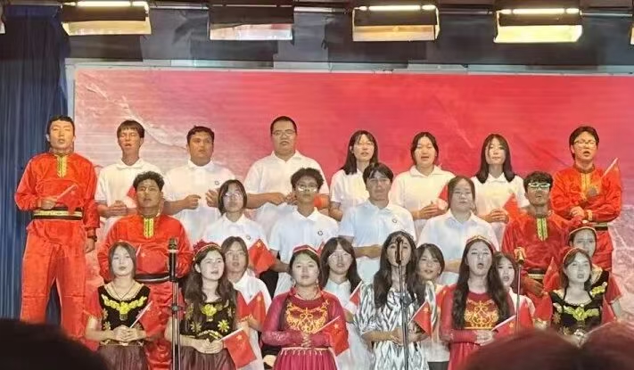 当晚会步入尾声,新疆学子身着色彩绚丽的民族服饰走上舞台,牵头唱响经典曲目《爱我中华》。清亮真挚的歌声里,满是各民族学子手拉手、心连心的赤诚,不仅是民族交融的生动写照,更成为学院民族团结教育的鲜活注脚。最终,全场师生共同合唱,晚会在磅礴激昂的旋律中圆满落幕。