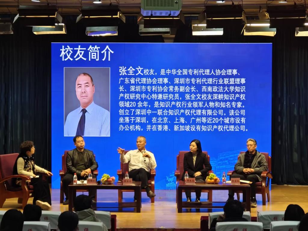 恳谈会上,张全文校友向同学们分享了自己的学习工作经历,跟同学们交流了知识产权相关问题,他友表示,知识产权企业在中国发展蒸蒸日上,知识产权在中国的发展前景一片光明,激励广大同学踔厉奋发、努力拼搏。他强调,知识产权领域是社会进步与国家发展的关键一环,而我国现如今在这方面面临着专业人才缺少的问题,要拓宽知识产权发展道路,就必须大力培养专业人才,知识产权专业学生要珍惜在校时间,努力学习专业知识并提高自身的专业素养,力争成为一名全面发展的新时代行业人才。同时,张全文校友也谈到了相关专业毕业生就业问题,他指出,在知识产权行业向好的社会大背景下,同学们要以德为先,先做人再做事,踏踏实实,不断提升专业能力,为知识产权行业的发展贡献出自己的一份力量。