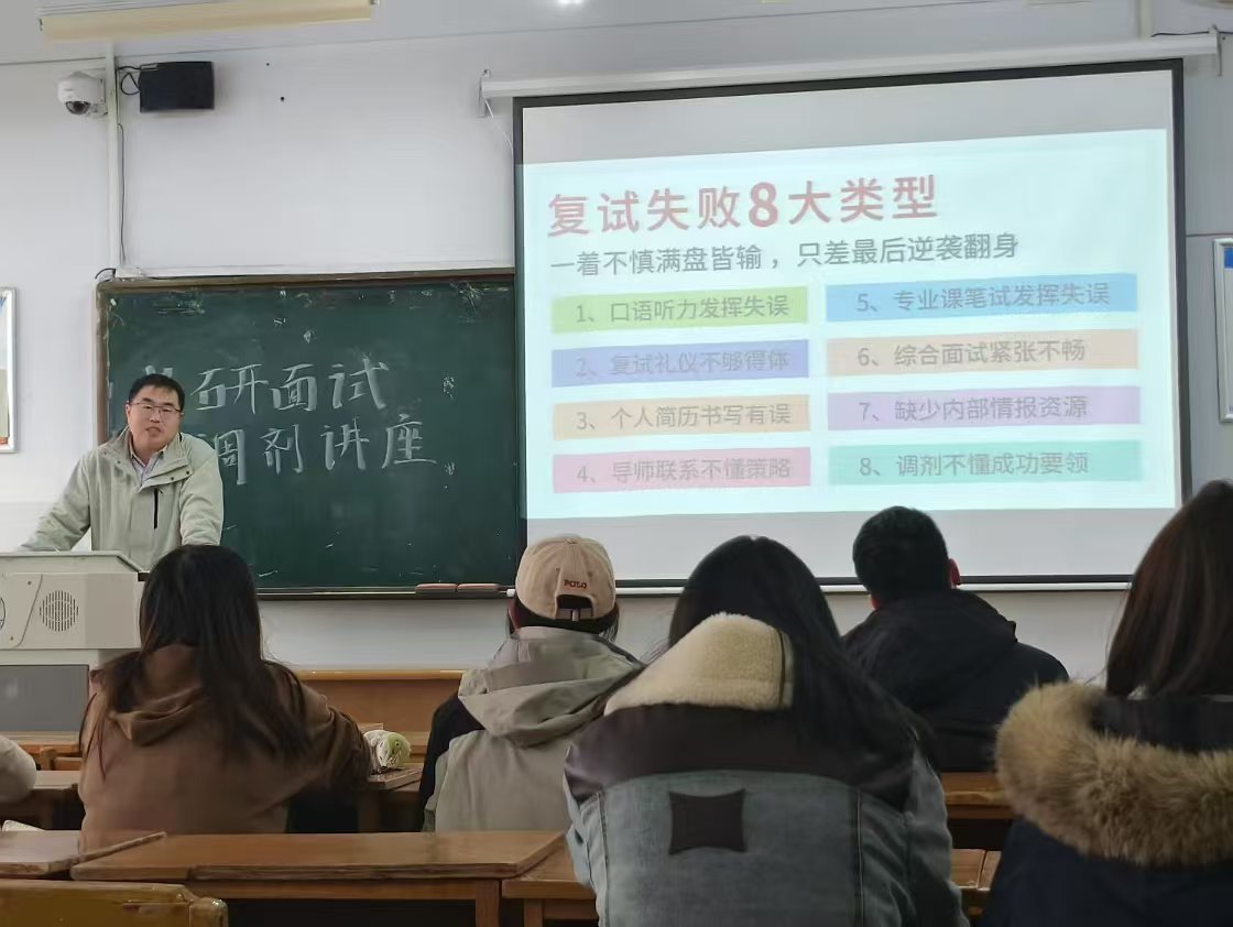 为了助力我校学子对考研复试有更加深刻的理解和更大的竞争力,实现更优发展,2025年3月14日网投十大信誉可靠平台举办了考研面试调剂讲座。本次活动特别邀请了考研方面的专家史老师和孔老师,史老师通过讲座和互动与同学们交流,为同学们搭建了走近考研复试的桥梁。