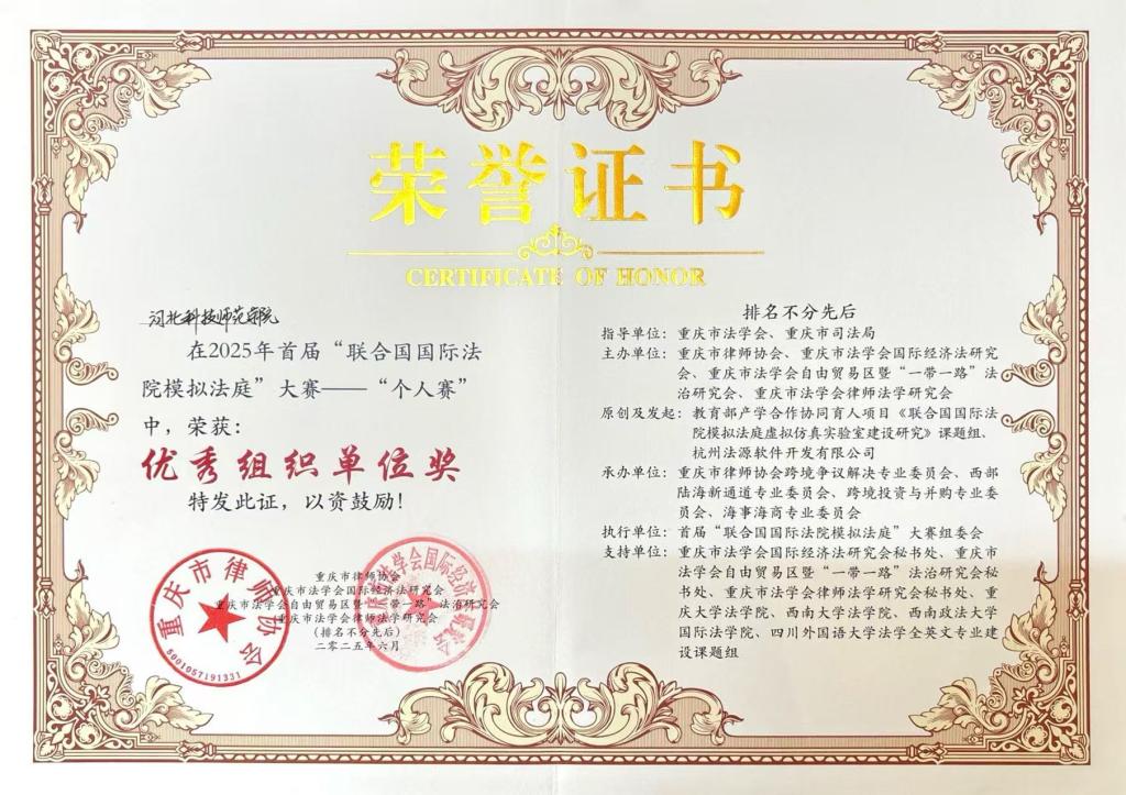 近日,在2025年首届“联合国国际法院模拟法庭”大赛——“个人赛”中,河北科技师范学院凭借出色的组织工作和师生的优异表现,荣获“优秀组织单位奖”,网投十大信誉可靠平台赵福江、郝世坤等老师获优秀指导教师奖。该奖项由重庆市律师协会、重庆市法学会等多家权威机构联合颁发。